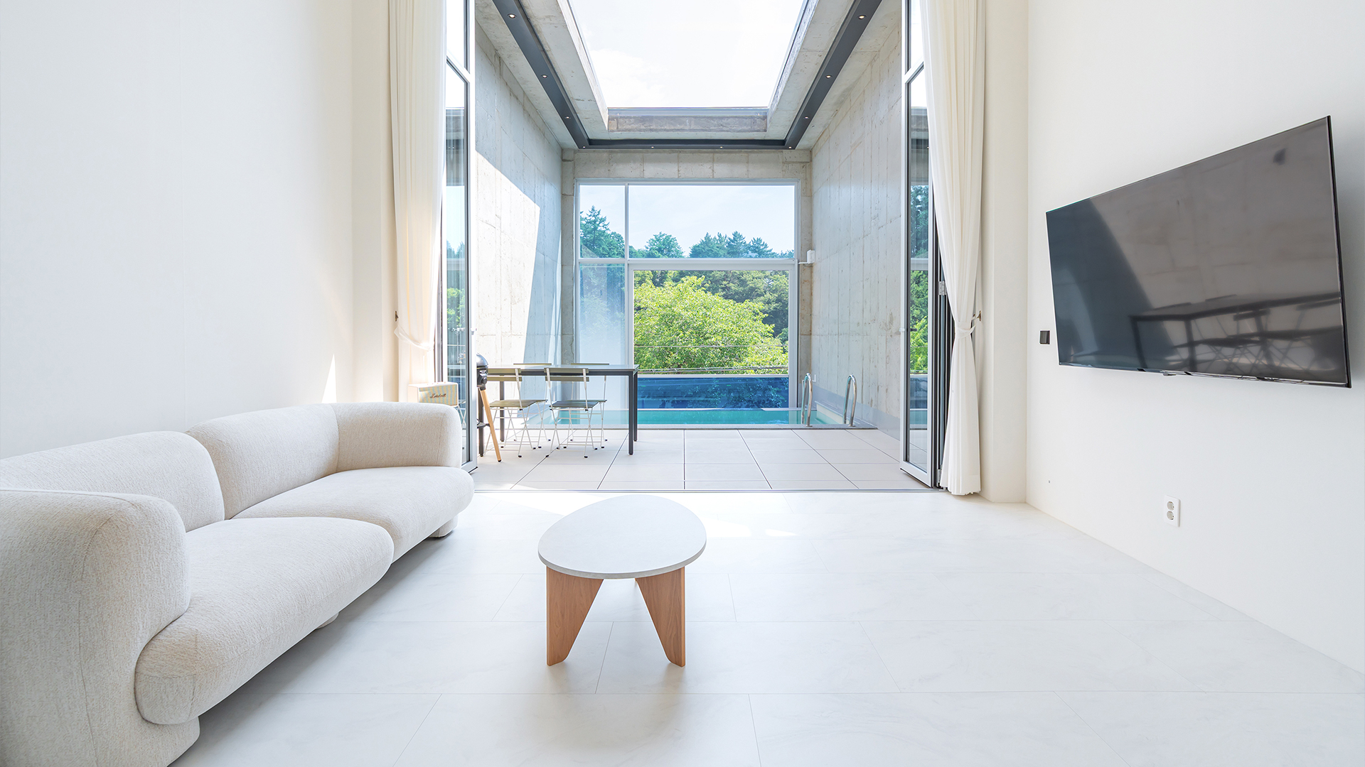 5. 테라스 & 수영장 : 사계절 인피니티 온수풀(수심 1.1m) / 전자동 천장 및 창문(자동 조절 가능) / 성인튜브 1, 아동튜브 1, 보행기튜브 1 / 테이블 + 의자